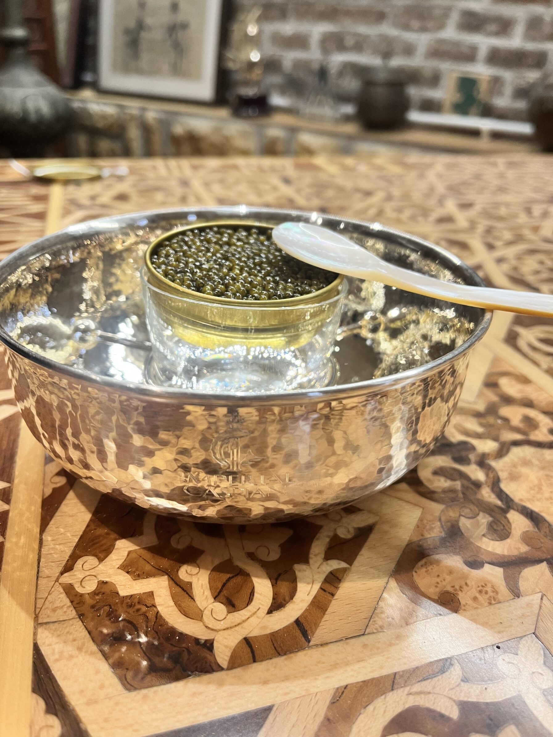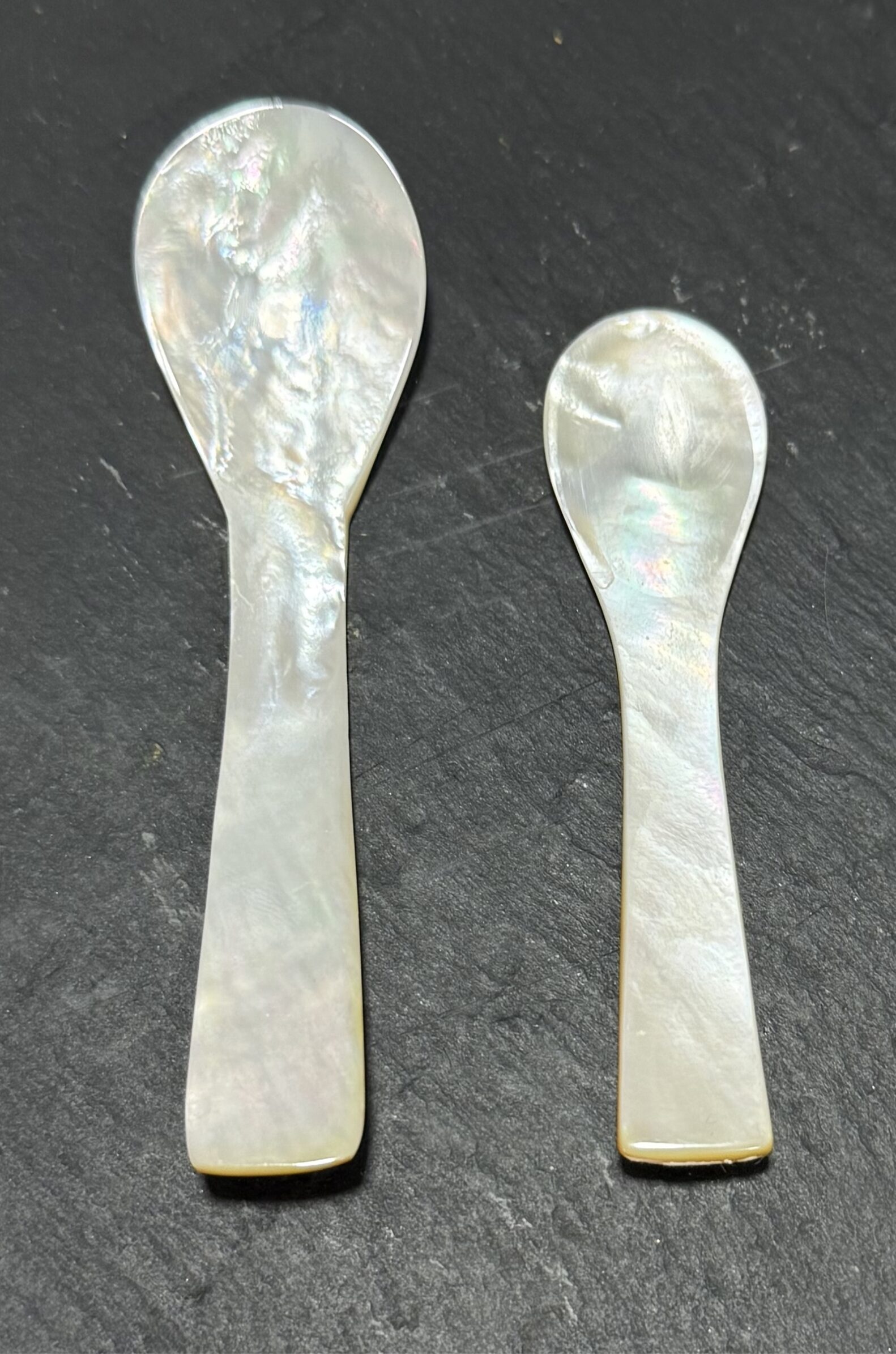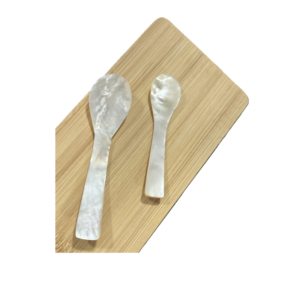 Origen: Elaboradas artesanalmente a partir de concha de madreperla de origen natural. Cada pieza es única, con vetas y reflejos iridiscentes que realzan la presentación del caviar.